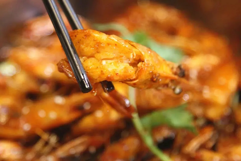 十幾種香料與秘制醬料烹飪的蝦火鍋