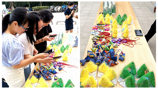 看著小姐姐認真的樣子,小哥哥快樂的笑容;用彩色筆在潔白的空殼雞蛋上畫出各式各樣的圖案,一個個漂亮的彩蛋就完成了。五色線、涂彩蛋、制香囊.....平時忙碌的生活與工作,在此刻都放松下來,享受著美好而又愉快的節(jié)日氛圍;怎么說也得拍張照片,紀念一下美好時刻。除了現(xiàn)場包粽子,我們還把端午的粽子送到了一位位商戶手中,帶著這份心意與祝福,共同度過這個美好的節(jié)日。