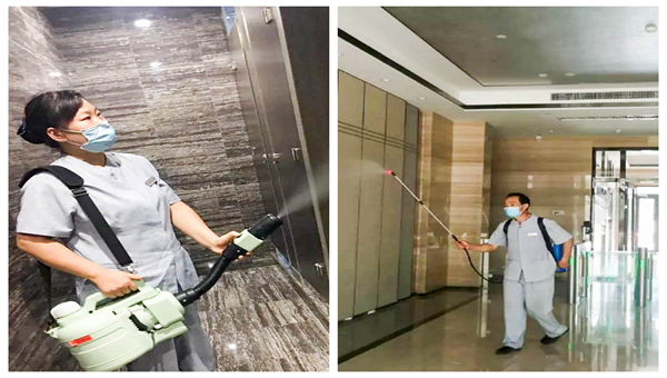 從疫情爆發以來,興業物聯保潔人員對寫字樓、公寓等公共設施進行消毒,目前為止,此類消毒已成為他們的既定工作。