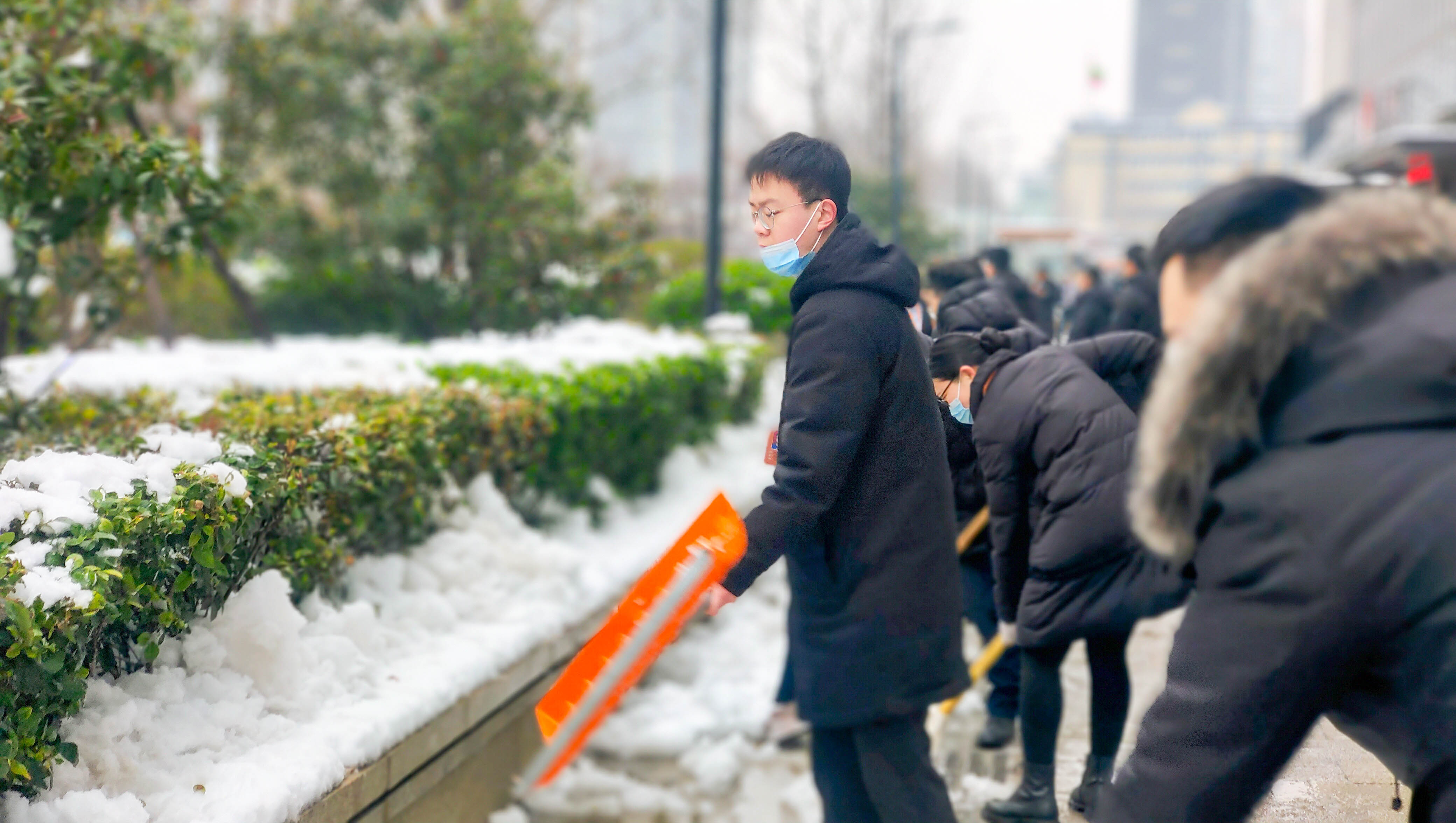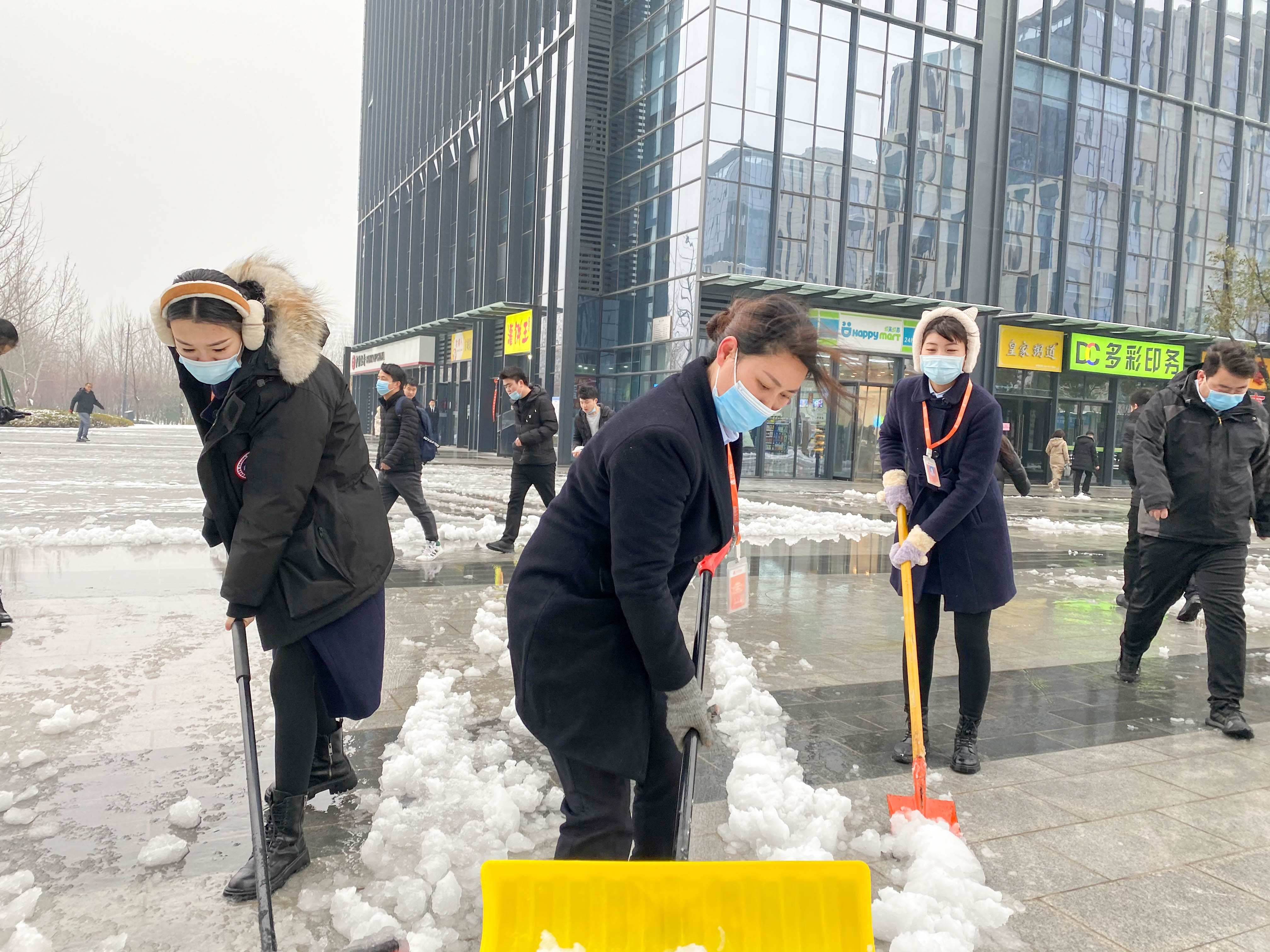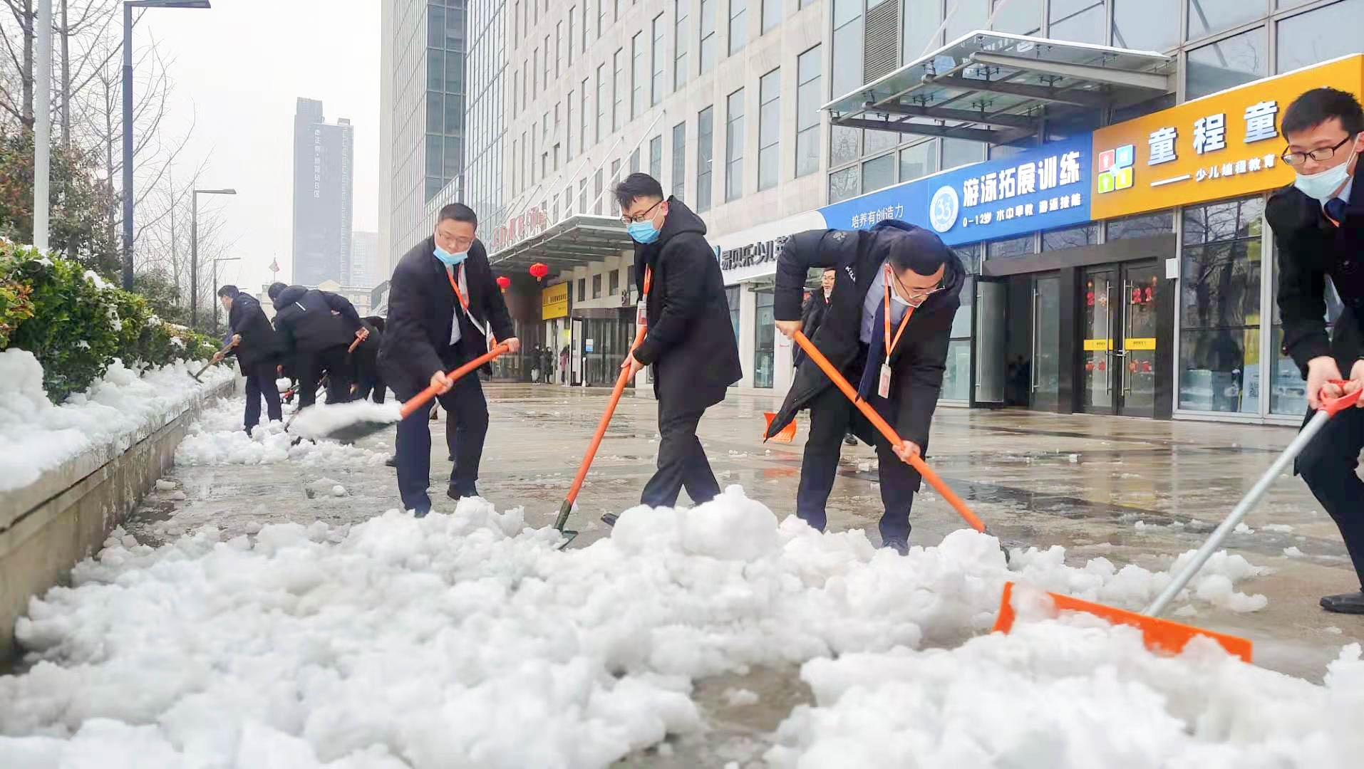 一場皚皚白雪,一群雪中的物業人。他們的背影成為寫字樓廣場一道靚麗的風景線。