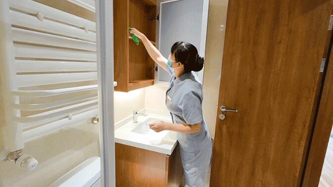 在交房的兩個月前,保潔團隊就已進駐園區(qū),對公區(qū)和1000多戶精裝房內(nèi)窗縫、玻璃、吊頂處、櫥柜、地板等進行擦拭除塵。