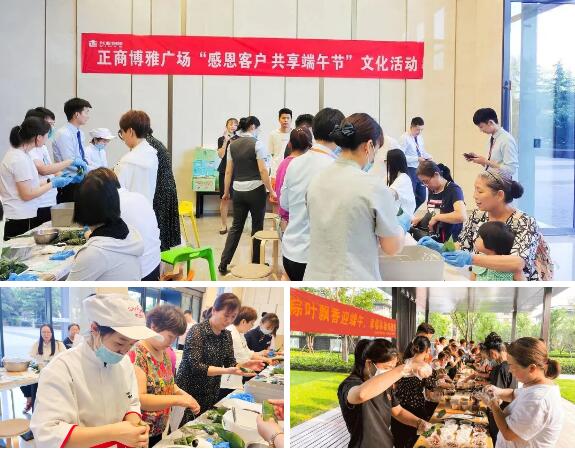 在正商博雅廣場、匯航銘筑、濱河銘筑,老人、青年、孩子齊上陣。專注的神情、專業的模樣;飽滿的粽子在絲線的纏繞下呈現棱角分明的美感。