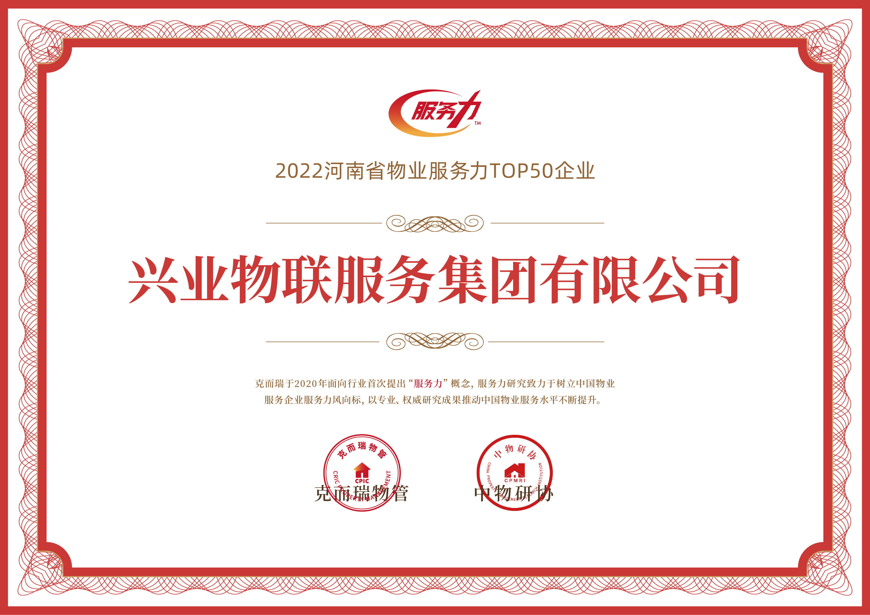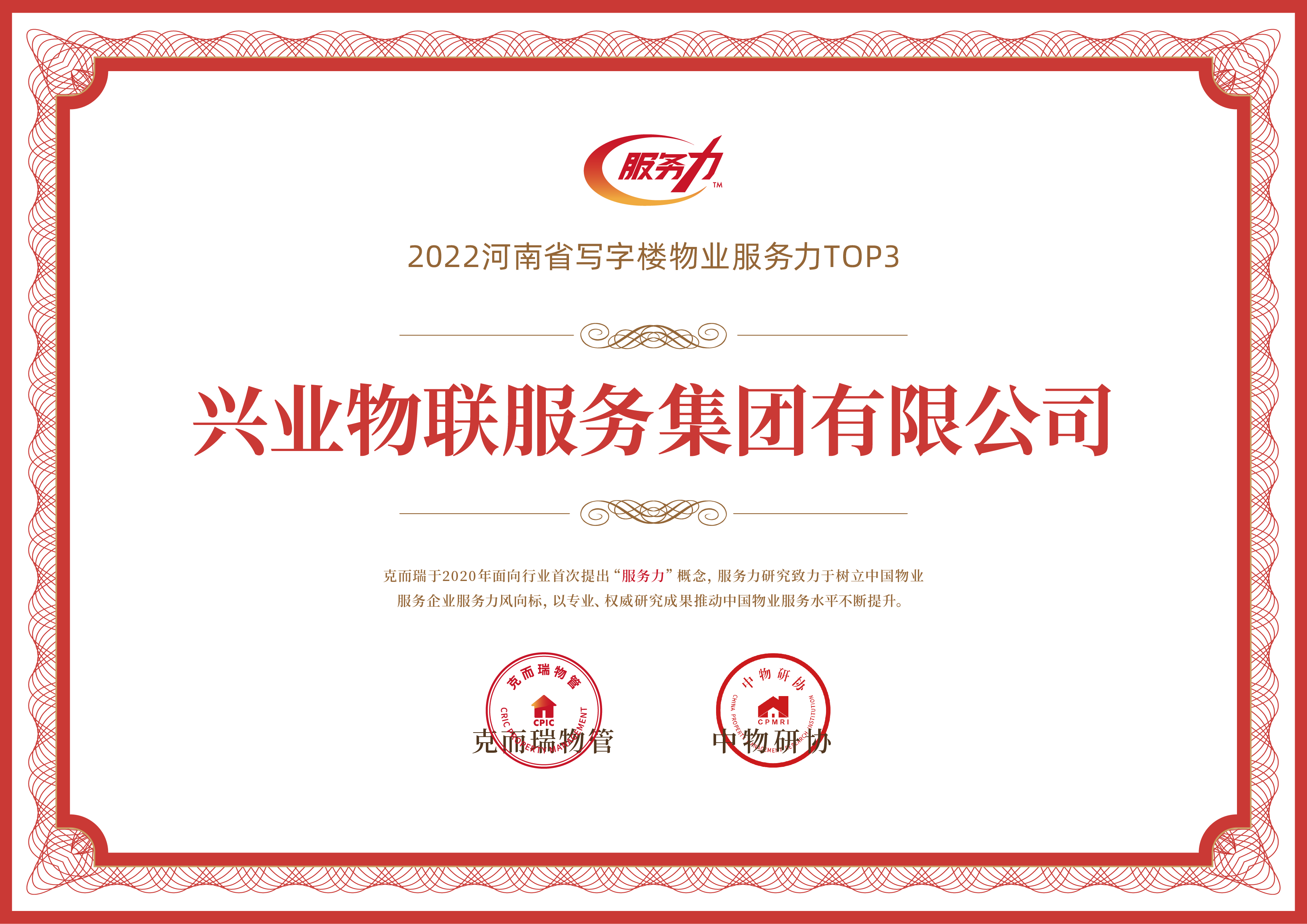 興業物聯憑借憑借企穩向好的綜合實力,專業的服務能力以及品牌創新能力榮獲“2022河南省物業服務力企業TOP13”、“2022鄭州物業服務力企業TOP3”、“2022河南省寫字樓物業服務力TOP3”。